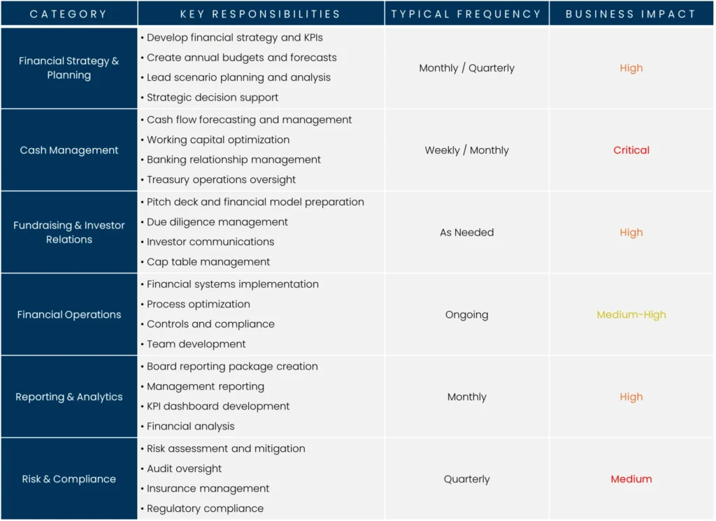 Not all these responsibilities occur with the same frequency nor are they of the same priority for the business (although all are critical in the long term). Here is a table outlining the frequency and impact of the core responsibilities of a fractional CFO: