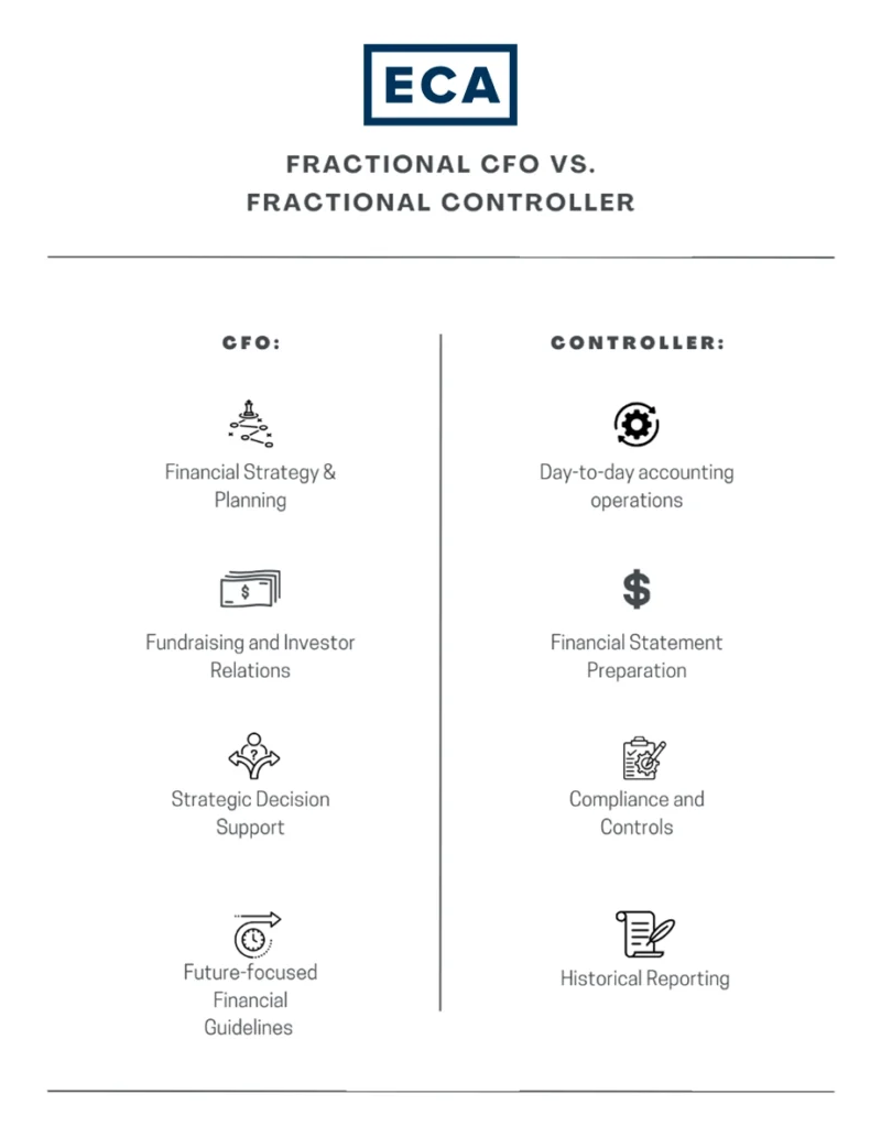 As the table above shows, fractional CFOs are typically more strategic and more focused on the future financial performance of the company. Controllers, on the other hand, typically focus on day-to-day financial operations and the past or historical financial performance of the company.