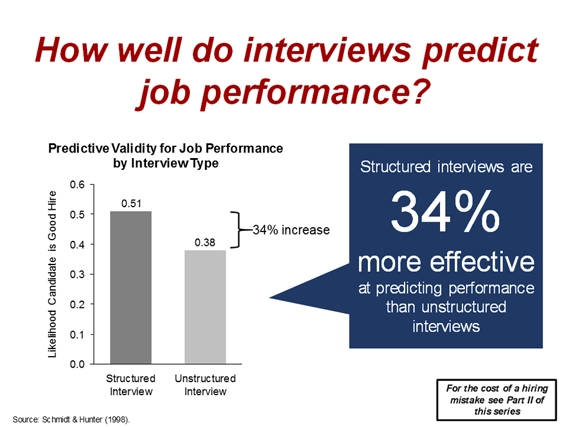 The numbers tell the story. According to Schmidt and Hunter's landmark 1998 meta-analysis published in Psychological Bulletin, which synthesized 85 years of personnel selection research, structured interviews achieve validity coefficients of .51 compared to .38 for unstructured interviews when predicting job performance. This means structured interviews are significantly more effective at identifying candidates who will succeed. By preparing specific questions in advance based on thorough job analysis and using standardized evaluation criteria, hiring teams can compare candidates objectively and make decisions based on demonstrated competencies rather than whether someone gave a firm handshake.