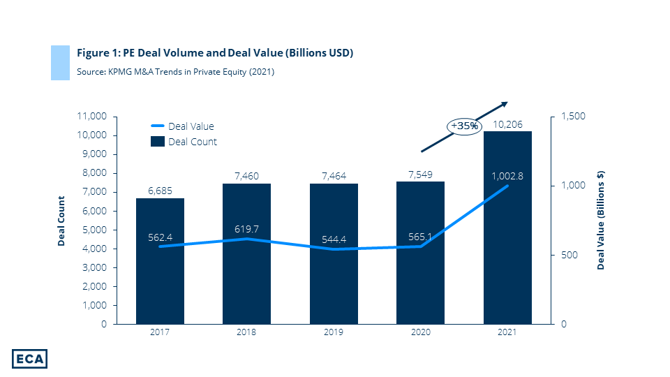 Unsurprisingly, given their centrality to PE’s success, there is a high and growing demand for CFO roles. There are a few underlying reasons behind this demand, in addition to the general desirability of CFOs due to the multiple critical duties they perform for PE firms and their portfolio companies. For one, PE deal flow is increasing. PE deal flow volume has been steadily rising over the last decade, with a huge 35% jump between 2020 and 2021. Because of CFOs’ important relationship to the deals process, demand for strategically minded portfolio CEOs has skyrocketed alongside this general trend.