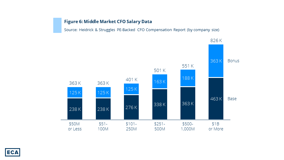 If you’re targeting a CFO role, it’s useful to understand expected compensation and how this is benchmarked, especially in terms of equity/carry. Generally, the larger the company, the larger the base and bonus tend to be. As Heidrick & Struggles report, the proportion of compensation shifts significantly once companies hit the $1Bn mark – at this point, the bonus tends to be a much larger proportion compared to the base salary.