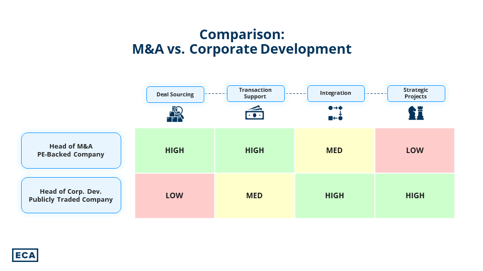 Another useful way of differentiating these roles would be to examine how their functions vary somewhat across companies of different sizes. Corp Dev roles – especially at larger companies – generally see much slower volume (perhaps 1-3 deals per year), whereas PE add-ons tend to be more frequent because of the smaller scale of those transactions. As such, these M&A roles are going to involve more on the sourcing and transaction side. The corp dev roles, in contrast, are going to spend more effort making sure that the acquisitions that have gone through are really working, since there is far more at stake with each of these deals.