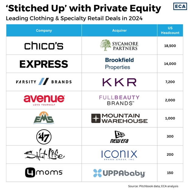 In fact, 2024 witnessed a number of high-profile PE investments in major fashion and retail brands, including Sycamore Partner’s investment in Chico’s and Brookfield’s deal to invest in Express.