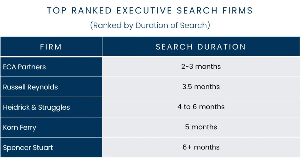 Why? Well, these firms are much slower than their smaller competitors like ECA Partners at finding a CFO or other executive (see the table below). Many of them take as long as six months to find an executive.