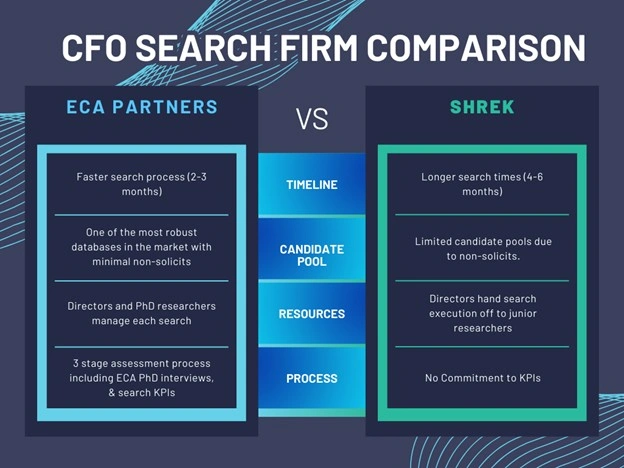 At the end of the day, choosing a search firm to find your next CFO is a tough decision. Large public companies and public entities like the federal government often partner with SHREK firms. However, for Private Equity looking for both speed and accuracy, a smaller partner like ECA can provide more satisfactory results for CFO and other executive searches.