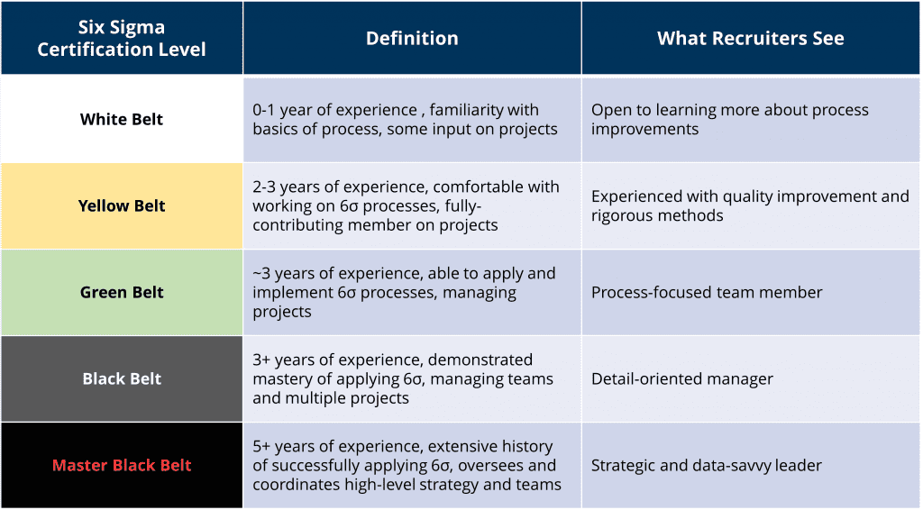 From a recruiter’s perspective, it is not always immediately obvious what a Six Sigma certification means on a candidate’s application. The system uses a martial arts style colored belt rating, with each color indicating a different skill specialization and level of seniority. Understanding what each of these levels mean, as well as the skillset that a Six Sigma certification requires, will allow you to frame your experience in a way that a recruiter can more quickly and accurately assess your fit for a role.