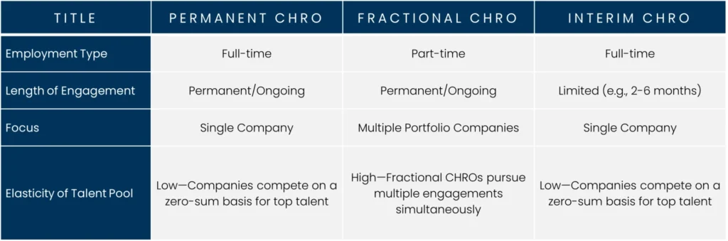 In this sense, a fractional CHRO is essentially a part-time CHRO who works a set number of hours or days a week. Fractional CHROs often split their time between different companies, making it a lucrative career option for experienced CHROs seeking a more flexible schedule. Like other fractional leadership, they can also be hired by a Private Equity firm to split their time between a number of portfolio companies.
